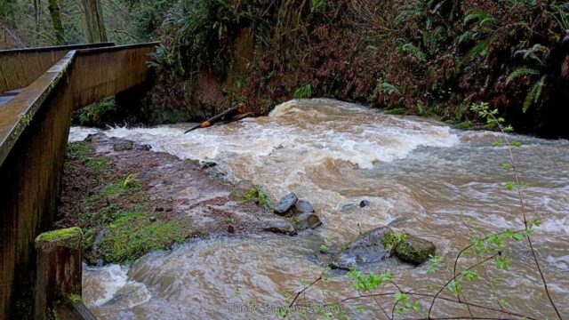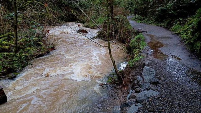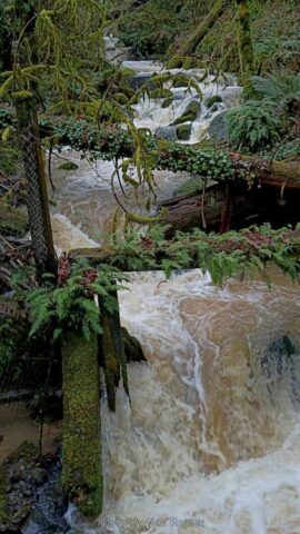 Normally I don’t post my training hikes or walks but this one had some special spots thank to the record rainfall we had. I have never seen Balch Creek with so much water coming down it. All other times it has had just a mild low water flow but this time it had white water rapids. I also came across a mud slide just below Pittock that blocked the road and left a house on the edge. I had plenty of wet muddy trails. My hike was 9 1/2 miles, 1800 ft. gain, about 450 stair steps in 4 1/2 hours.